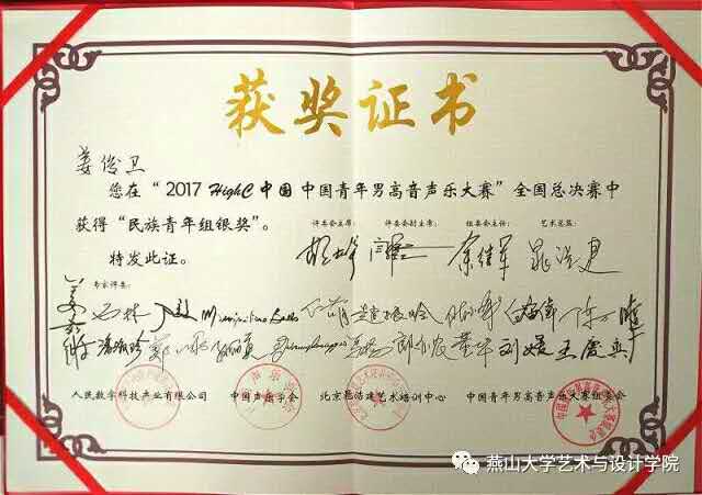 15级硕士研究生姜俊卫荣获民族青年组银奖的好成绩,继今年音乐政府奖金钟奖以来他再次为我校取得了荣誉。