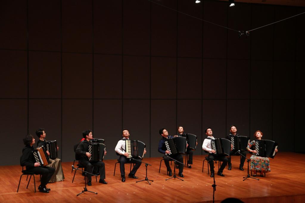登上代表国内最高艺术水准的国家大剧院舞台,同中外优秀演奏家一起上演了多部原创、改编作品,展现了键钮手风琴、键盘手风琴、班多纽手风琴等不同类型、不同风格的手风琴音乐。此次音乐会从多角度、多层次展现了手风琴这一乐器的丰富性,对手风琴音乐做出了进一步的探索与挖掘。国家艺术基金管理中心主任雷喜宁、天津音乐学院副院长靳学东、中央音乐学院教授曹晓青、我国著名手风琴演奏家张天宇、杨屹等嘉宾来到了现场。董梁飞老师的参演充分的展示了我院音乐系手风琴专业的水平。