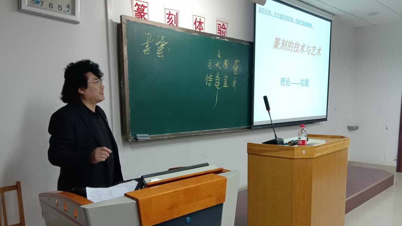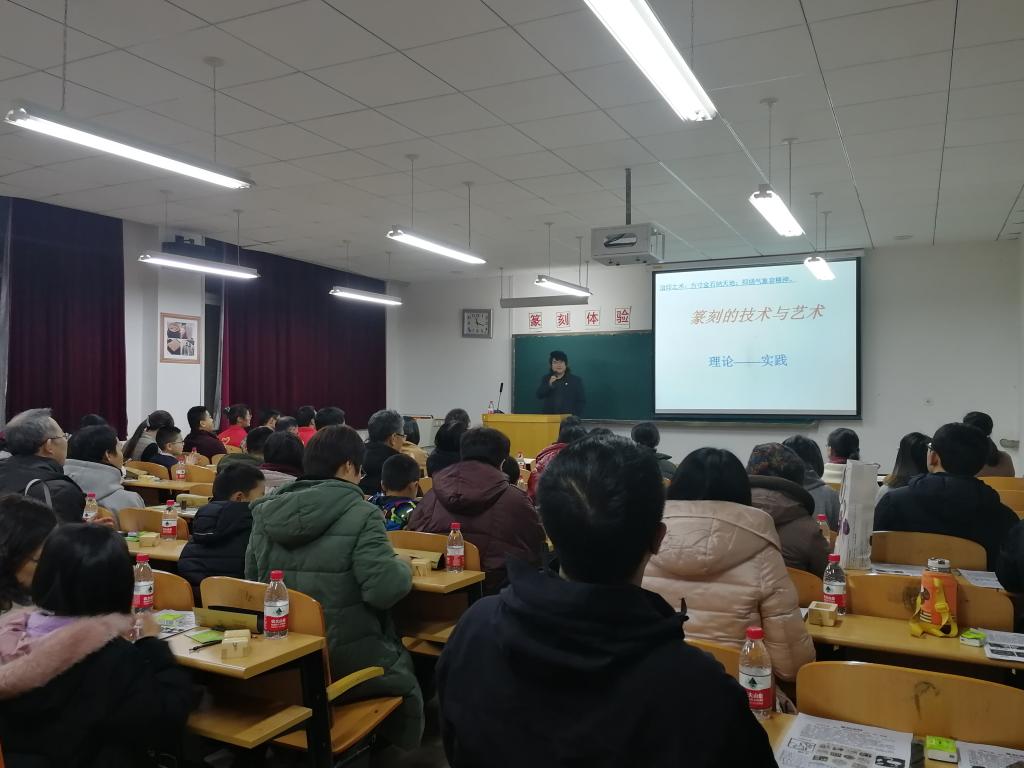 美术馆A101多媒体教室举行,活动共分为篆刻作品展示、篆刻理论讲解、篆刻实践练习三部分,吸引了全校56名教职工和11名小朋友积极参与。