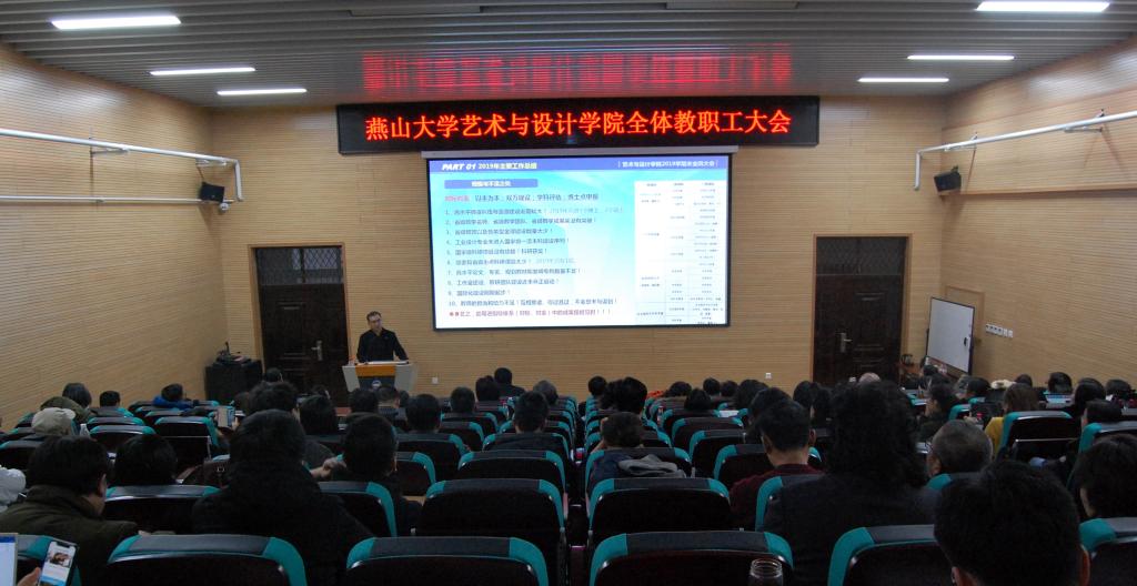 孙利院长在报告中指出:2019年,全院教职员工团结一心、脚踏实地、开拓进取,在大家的共同努力下,学院教学、科研、人才培养、国际化建设、实践活动、竞赛获奖、学生工作和校友工作等方面均取得了较好的成绩。在学院特色亮点工作中,特别提到了我院视觉传达设计专业毕业生杨立前的创新创业事迹得到了李克强总理的肯定;2019届《融智融创融生》本科毕业设计作品展系列活动、“设计赋能 融创未来”2019河北省设计学智库及研究生教育国际论坛、河北省工信厅装备制造企业对标活动社会影响较大,持续扩大了学院的学科专业影响力;学院承办的“承重筑燕园匠心迎百年”文艺晚会、“不忘初心、牢记使命”主题教育文艺汇演以及2020年新年音乐会,受到校内外的广泛赞誉。