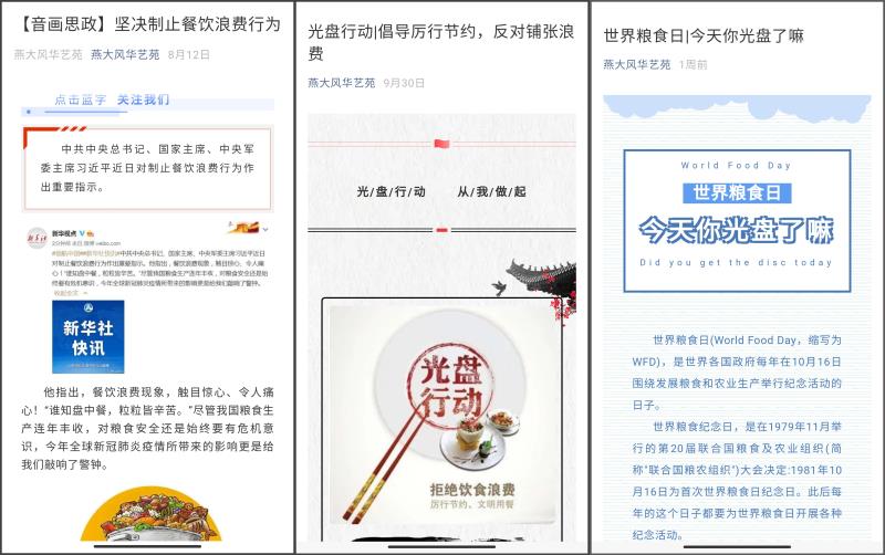 学院持续开展“天地粮心、惜墨如金”系列宣传活动,利用“燕大风华艺苑”网络平台,已发布3期“世界粮食日|今天你光盘了吗”、“光盘行动|倡导厉行节约,反对铺张浪费”、“【音画思政】坚决制止餐饮浪费行为”专题推文,在学院营造厉行节约、拒绝浪费的浓厚氛围,让勤俭节约的理念入脑入心,用图片、视频等接地气、入人心的宣传方式,在润物无声中影响观念、弘扬正气。