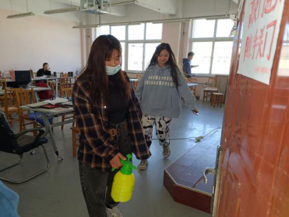 青年志愿者采用分组喷洒消毒液的方式对学院各个专业教室进行了消毒。工作中,志愿者们认真细致,确保不留死角,为师生营造卫生的教室环境。