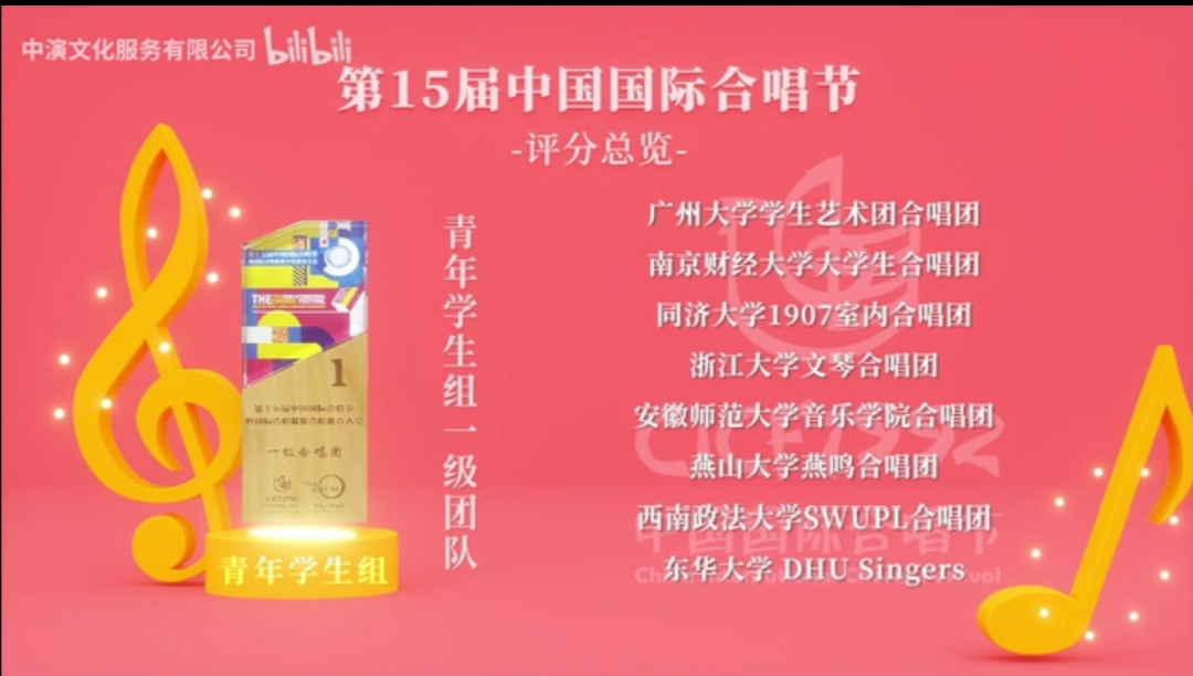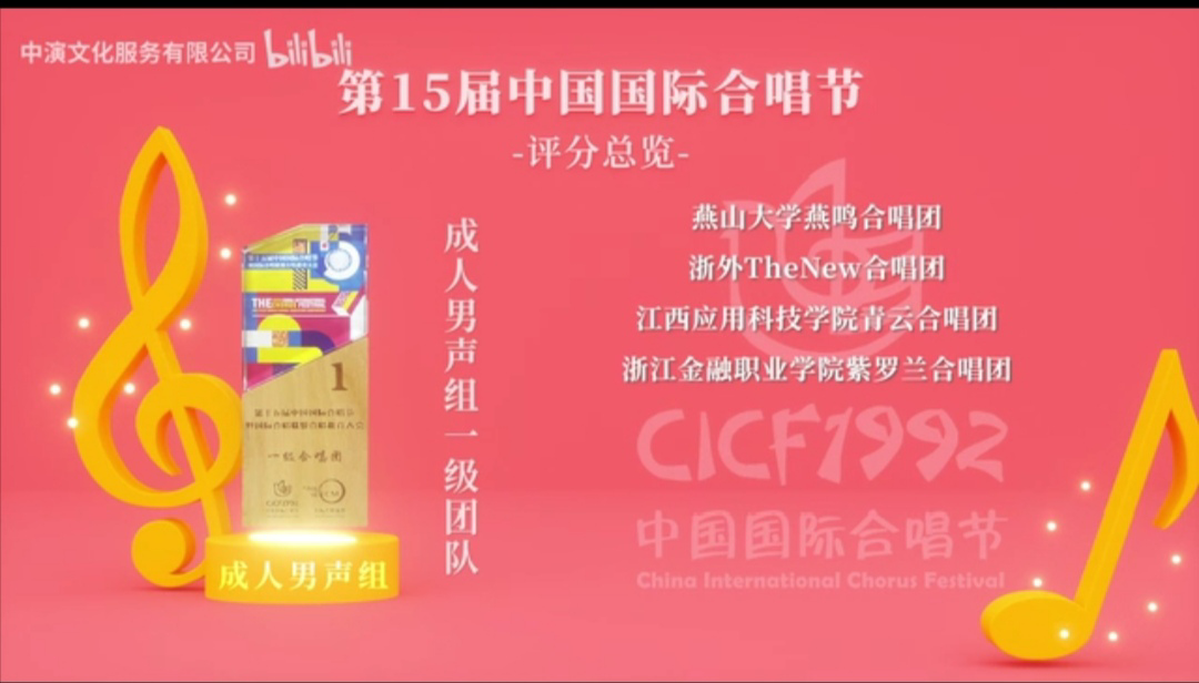 选送,燕鸣合唱团演唱的合唱作品《如梦令—常记溪亭日暮》、《送友人》以精彩的演唱赢得了评委们的一致好评。经组委会专家评审,分别荣获青年学生组和成人男生组“一级合唱团”(金奖)。这也是继2018年河北省大学生艺术展演荣获一等奖、2019年河北音乐金钟奖荣获金奖之后,燕鸣合唱团再次取得突破,在我国举办的规模最大、规格最高的国际合唱赛事上获奖。