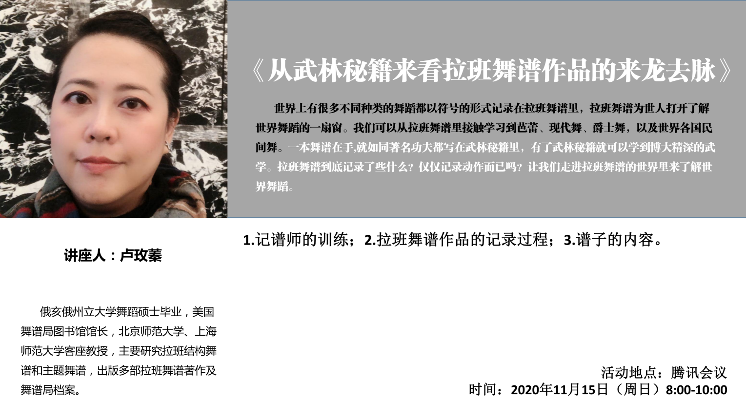邀请到美国俄亥俄州立大学舞蹈学硕士,美国舞谱局图书馆馆长卢玫蓁教授为舞蹈表演专业全体师生做了题为《从武林秘籍来看拉班舞谱作品的来龙去脉》的云端学术讲座。