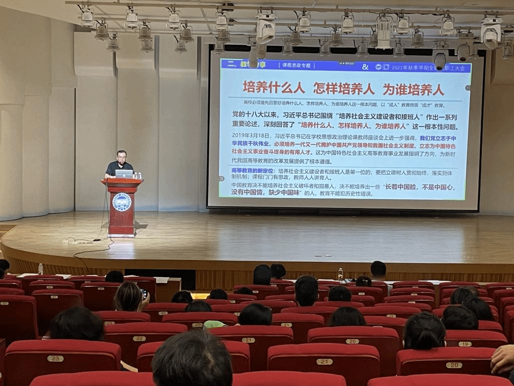 孙利院长首先结合习近平总书记近期在中央党校中青年干部培训班开班仪式上的重要讲话精神,从高等教育的新定位、高校首先要回答的几个问题等方面进行全面阐述;其次,孙利院长强调了“课程思政”的重要性,指出“课程思政”建设是落实新时代全国高等教育工作会议精神和实现教育立德树人这一根本任务的重要途径,教师要充分发挥课堂主渠道在高校思想政治教育工作中的作用。最后,孙利院长要求全院教师要提高对“课程思政”的思想认识,要求学院各专业深入探索专业人才培养与思想政治、道德教育有效结合之路,把价值观培育和塑造“基因式”融入课程,进而实现立德树人、润物无声。