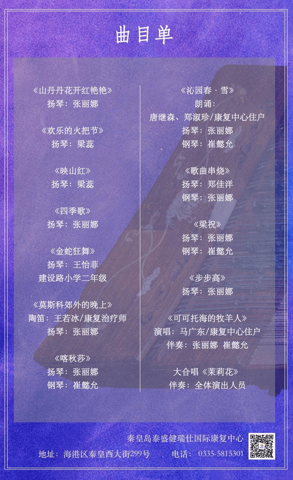 此次活动曲目丰富,有欢快喜气洋洋的《步步高》、《金蛇狂舞》,有优美动听的《映山红》、《山丹丹花开红艳艳》、《四季歌》、《梁祝》、《莫斯科郊外的晚上》和《喀秋莎》,最后全场合唱经典歌曲《茉莉花》,为康复中心的老人带来温馨而愉快的新年扬琴沙龙。