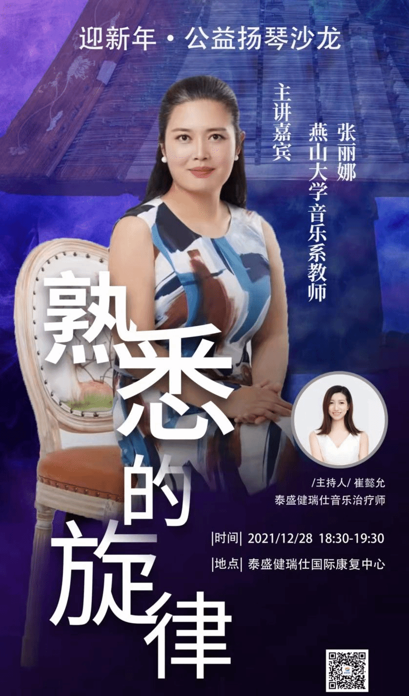 敬老爱老,喜迎新年。12月28日晚,我院音乐系教师张丽娜赴泰盛健瑞仕康复中心举办“熟悉的旋律”---迎新年公益扬琴沙龙。为中心的老年人、康复病人和家属、及医护人员现场讲演经典旋律、革命红歌等大家熟悉的经典旋律。