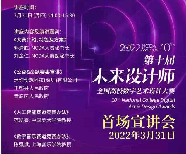 本次宣讲会由(NCDA)大赛组委会及专家主要针对大赛介绍、特色及方案,公益命题赛事宣讲、人工智能赛道竞赛办法、数字音乐赛道竞赛办法等专项赛道的参与指导进行了宣讲。