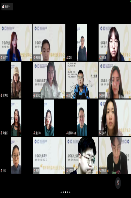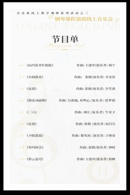 钢琴课程思政线上音乐会》。音乐会的钢琴指导教师有李锋、金红莲、潘雅清、孙英、丛玉婷、赵悦,参加音乐会的学生有侯帅、钟晴、于博童、侯昌昊、牛星予、贾梦媛、李金洪、李棠溪和杨宁。