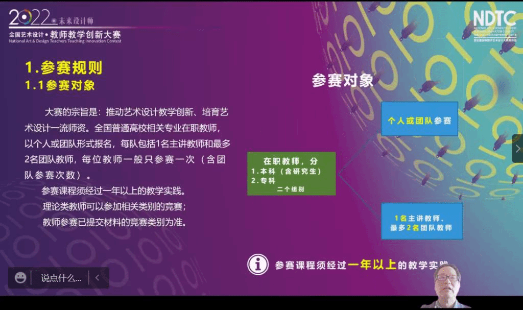 范凯熹教授从四个方面讲解了参赛规则,强调了参赛对象、参赛日程、教学视频、创新报告国赛评审的侧重点,从评审专家的角度对参赛课程的评价方法、评审规则、打分原则等细心解读,并分享了教学新技术应用的实例,将PBL教学模式结合教学成果同步展示,提出了对教学观念与教学方法的深度思考。