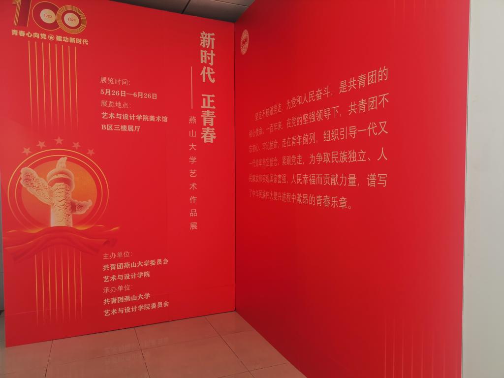 团委承办。目的是在庆祝建团百年和喜迎二十大之际,引导青年学生用艺术的形式学习党领导青年书写激昂篇章的光辉历程,记录新时代发展的美丽画卷,展现青年学子不忘初心、牢记使命,永远跟党走、奋进新征程的责任担当。作品展于四月中旬启动,得到了同学们的积极响应,活动共征集海报、摄影、书法、篆刻、刻纸等艺术作品200余件,本次展出的121件作品均体现了爱党爱国、时代精神和燕大特色。作品展于5月26日至6月26日持续展出。