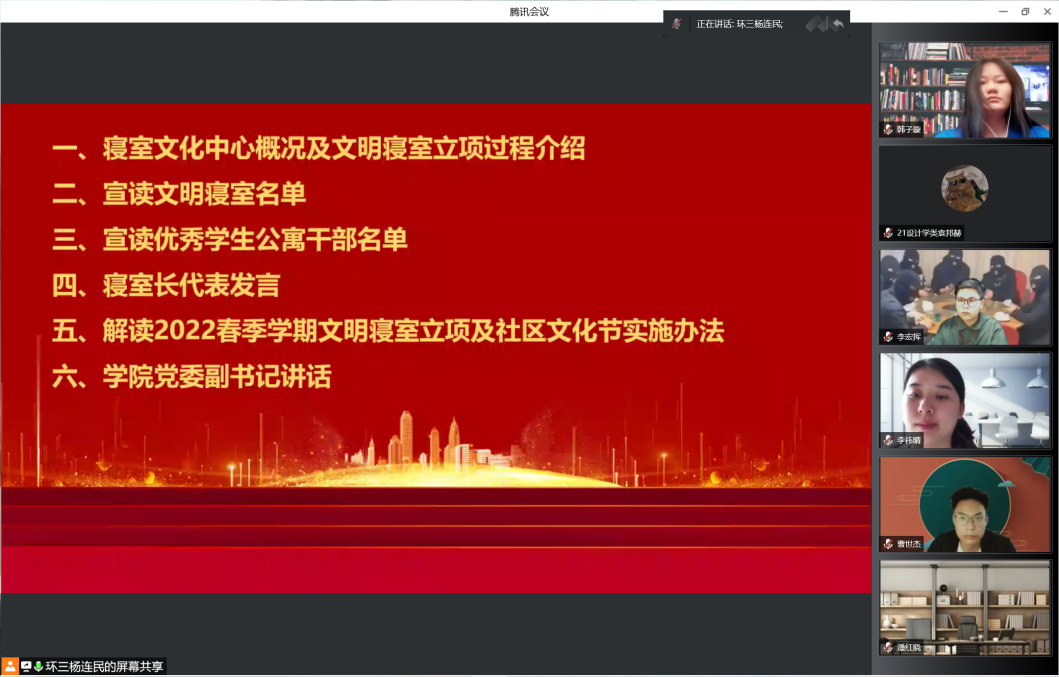 通过视频方式召开2021年文明寝室总结大会暨2022年春季学期学生社区“文明寝室”建设会议。学院党委副书记宁岩鹏,辅导员盖鸿章、丁旺龙、闫佳宁、本科2020级、2021级班长、生活委员和寝室长等160余人参加会议。会议由寝室文化与社区环境营造中心学生负责人杨连民主持。