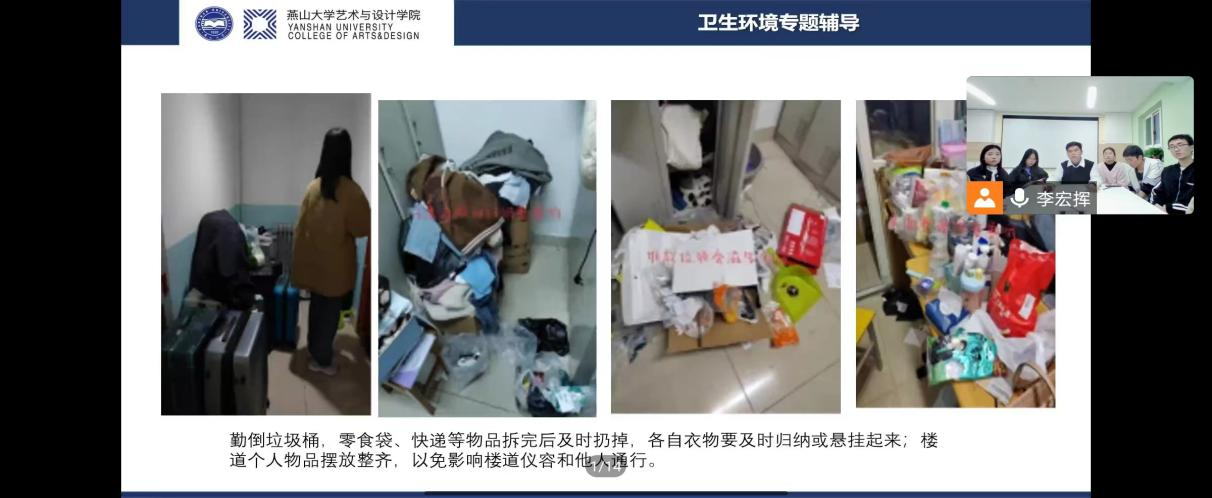 寝室文化与社区环境营造中心学生李宏挥介绍学院寝室卫生环境标准和办法。通过展示一些反面案例表明卫生问题的存在不仅仅影响同学们的日常生活,还会危害到身心健康;说明使用违禁电器和私拉插排危害,对如何安全用电进行指导。