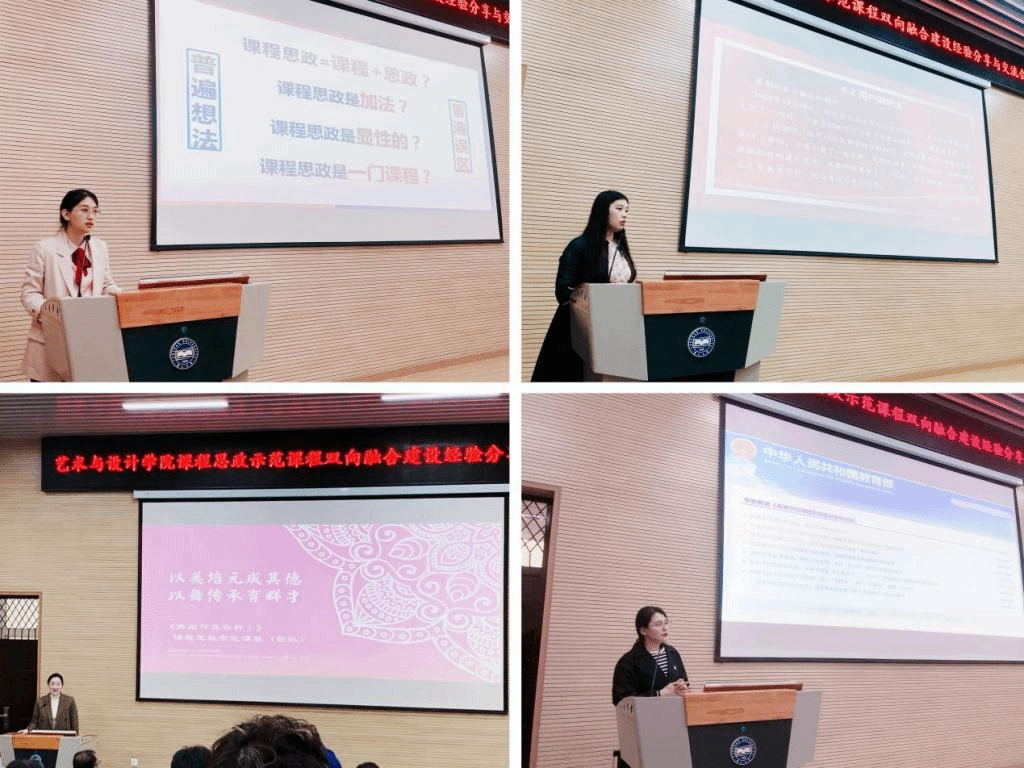 卢颖老师和马克思主义学院张畅老师、杜利英老师的《设计方法学》教学团队;刘燕老师和马克思主义学院李小东老师的《舞蹈作品赏析I》教学团队,分别做了分享。