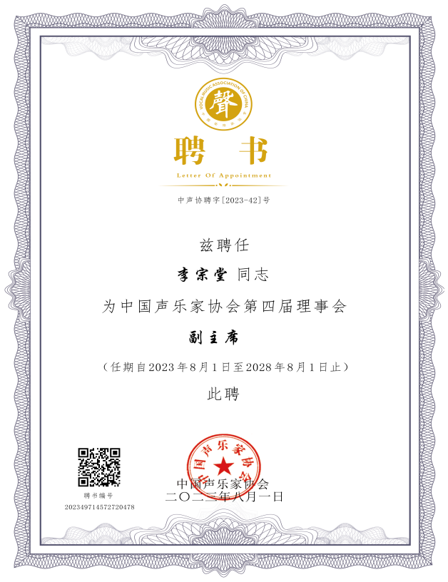 2023年8月1日,中国声乐家协会第四届理事会议,在杭州市浙江音乐学院成功召开,大会选举产生了新一届理事会及主席团,李宗堂教授当选中国声乐家协会第四届理事会副主席。
