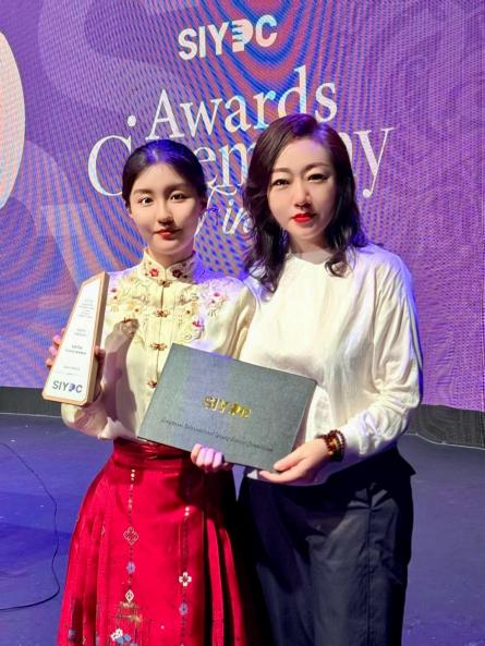 潘雅清副教授与学生王灿颁奖合影(摄于新加坡首都剧院)