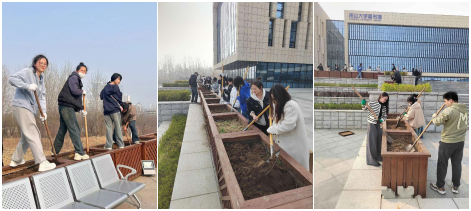 现场由图书馆和后勤服务中心的工作人员介绍图书馆园艺规划,指导学生为花池育壤松土。同学们带上手套、挥动铁锹、,认真按照育土播种知识要求,展开劳动教育实践。图书馆周边尽五十余座花池在同学们两个小时的劳动下焕然一新,土壤丰盈饱满孕育生机,凌乱的角落变得井井有条,使人心情愉悦。同学们的欢声笑语如同一支优美的乐章,洋溢着青春的活力和热情。后勤服务中心的老师傅称赞同学们学得快、干的好,为建设美丽校园环境共同出力、共同进步!