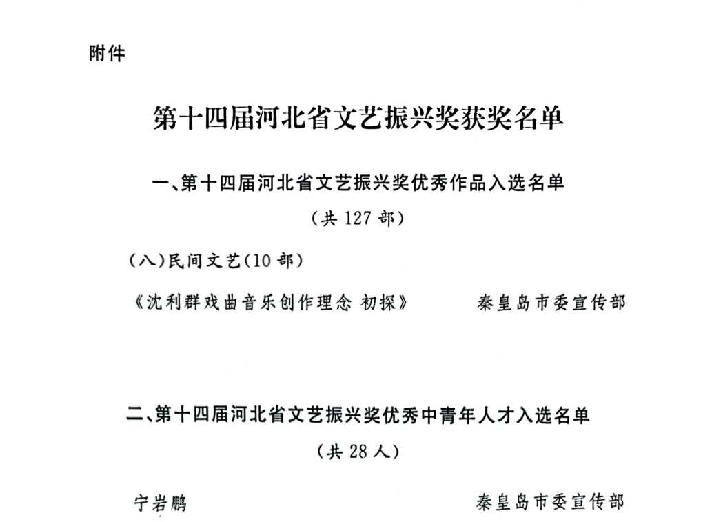 第十四届河北省文艺振兴共评选优秀作品奖127部,其中文艺评论10部;优秀中青年人才奖28人,其中声乐2人。我校中青年优秀人才奖入选者宁岩鹏,现为中国音乐家协会会员,教育部全国普通高校毕业生就业创业指导委员会委员,多年来致力于声乐艺术表演、歌曲创作、声乐艺术与思政教育融合,长期活跃在省、市、学校的文化宣传舞台上,曾荣获河北省第七届音乐“金钟奖”民族唱法金奖,第十四届河北省精神文明建设“五个一工程”优秀作品奖等。颜景旺入选的优秀作品《沈利群戏曲音乐创作理念初探》,从“元理论”视域总结了我国当代著名作曲家沈利群先生的戏曲音乐创作贡献,主要从“全方位介入”的创作理念、“音乐写意观”的创作导向、“顾及一般民众”的创作观念三方面对其创作思想进行了当代阐释,这对我国当下的戏曲音乐创作与发展具有重要的启示性意义,该作品曾荣获第十二届河北省文艺评论奖一等奖。