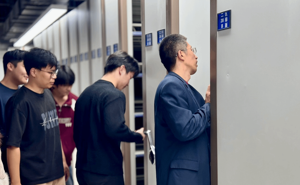 在图书馆老师的指导下,有序地进入密集书库。密集书库作为图书馆的重要存储区域,投入使用后将存放着大量的图书资料,但由于空间有限,图书的摆放和管理显得尤为重要。此次贴层架标活动,正是为了进一步优化书架层级关系和提高查找效率。