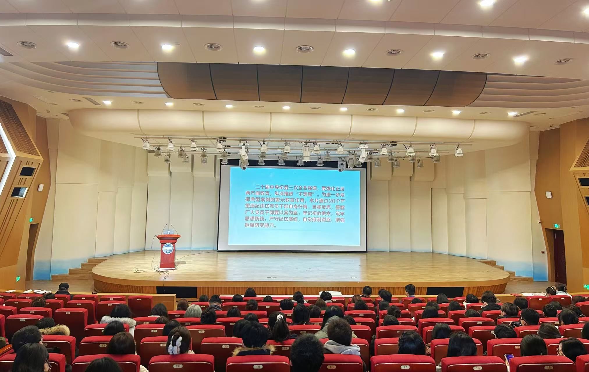 警示教育大会在音乐厅召开。会议深入学习贯彻习近平总书记关于党的自我革命的重要思想,并集体观看了警示教育片。学院党委书记张文超主持会议并讲话,学院全体师生党员参加大会。