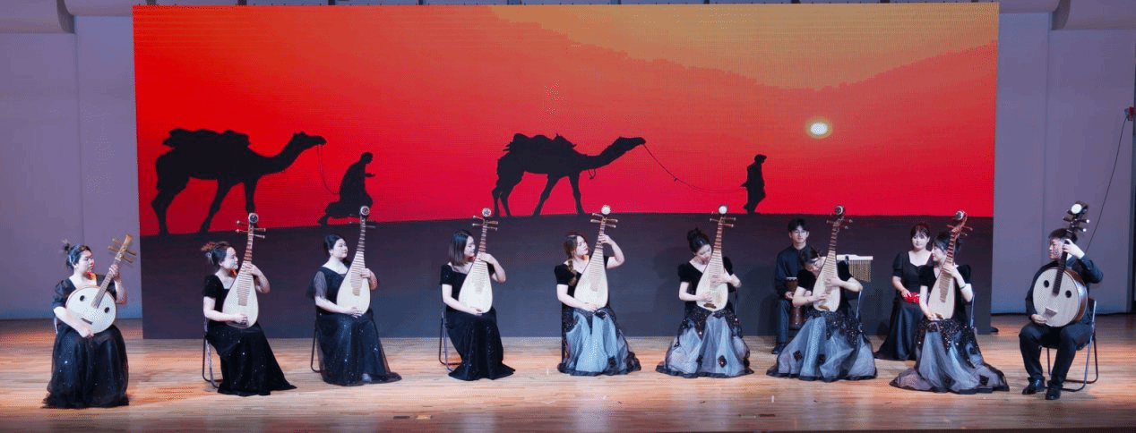 扬琴重奏《翡翠》表演中,清脆音色相互交织,似翡翠闪烁光芒,传递东方音乐独特韵味;琵琶重奏《丝路驼铃》用琵琶模拟驼铃与大漠风声,带领观众感受丝绸之路的孤寂与壮阔;古筝重奏《盛世国乐》以悠扬筝音展现盛世繁荣昌盛,彰显民族器乐的独特魅力;民乐合奏《我的祖国》采用多种民族乐器共同奏响,表达对祖国深深的热爱与赞美。