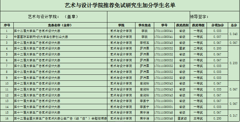 根据《成人短视频 本科生创新创业竞赛组织与管理办法(2020年修订)》,在校本科生参加创新创业竞赛获奖,可根据竞赛类别及获奖级别,在推荐免试研究生所依据的原始绩点基础上,给予相应的绩点加分,现根据学生申报情况汇总,做如下结果公示: