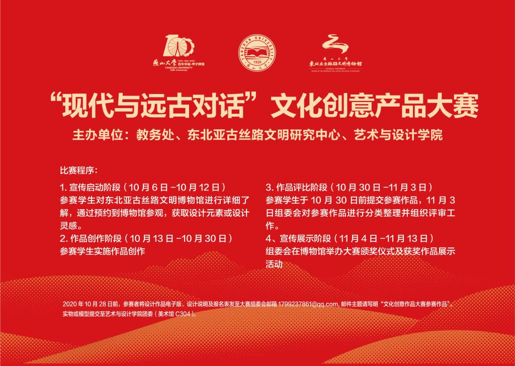 东北亚古丝路文明博物馆作为学校重要的文化阵地,开馆以来受到了广大师生的欢迎。为进一步探寻文物与文化创意的对接成果,用人文精神诠释校园文化品位,凝练特色文化品牌,浓厚的校园学创新氛围,提高师生学生的创新实践能力,为百年校庆增添文化气息。学校决定以东北亚古丝路文明博物馆馆藏文物为设计元素,举办 “现代与远古对话” 成人短视频