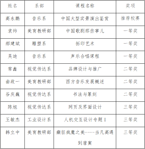 为全面推进学院课程思政建设工作深入开展,切实促进各类课程与思政课同向同行,我院于11月4日下午在美术馆C305会议室举办第四届“艺苑杯”课程思政教学竞赛。经评委现场打分,评选出推荐校赛和一、二、三等奖的教师及课程。比赛结果如下: