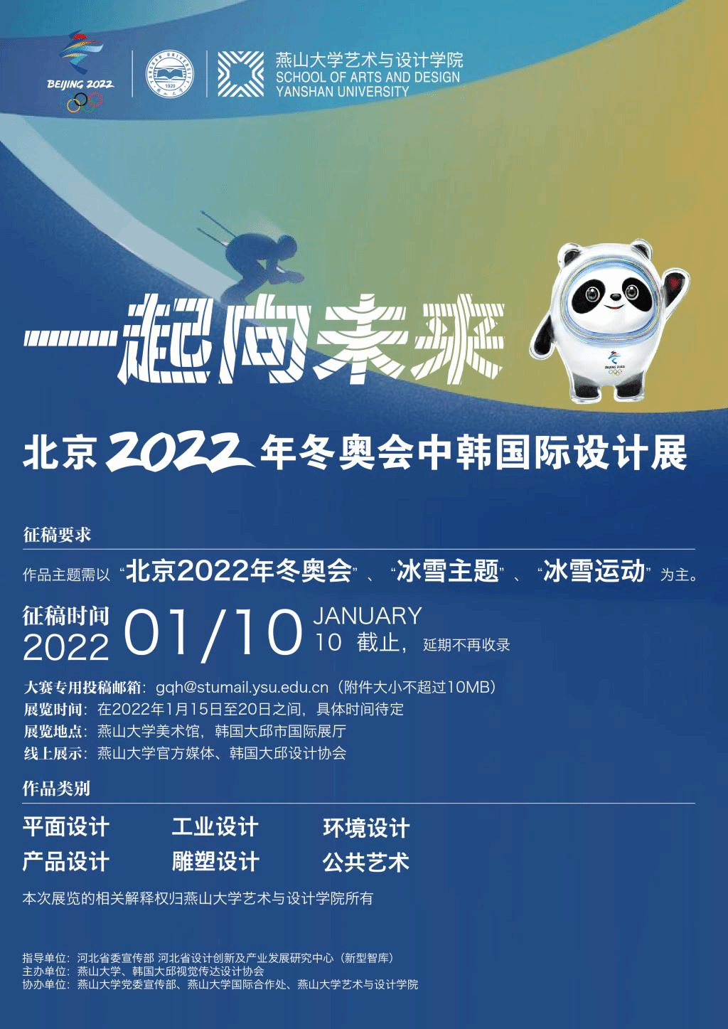 计划与韩国大邱设计协会共同主办“一起向未来”北京2022年冬奥会中韩国际设计展。展览以中、韩设计家为主,积极向日本、新加坡、马来西亚等国设计学专家发出征稿邀请,扩大国际影响力。展览涵盖工业设计、平面设计、环境艺术设计、产品设计、雕塑设计、公共艺术等设计类别,全面覆盖设计的各个层面,旨在进一步推广与“冬奥会主题”相关的创意思考和设计表达,探索冬季冰雪赛事创意设计及发展的新趋势,助力并提升北京2022年冬奥会的国际影响力。