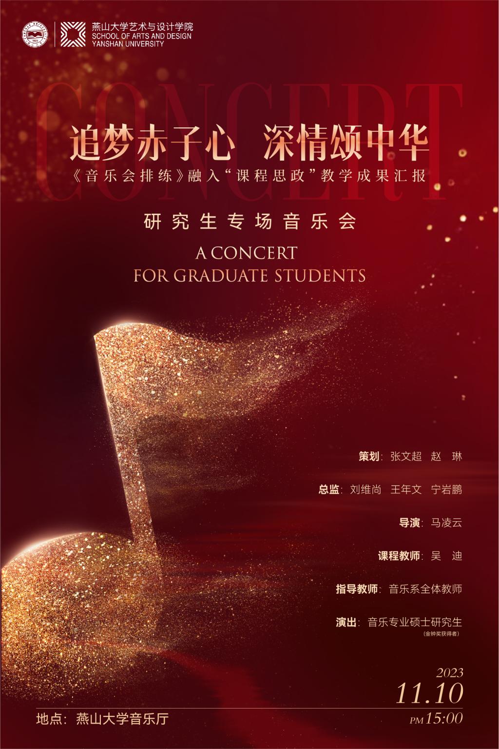 为推进课程思政建设,传承发扬优秀传统文化,推动成人短视频 音乐专业学科发展,助力校园文化建设,成人短视频 将于2023年11月10日15:00 ,举办“追梦赤子心,深情颂中华”2022级艺术硕士(音乐)专场音乐会。