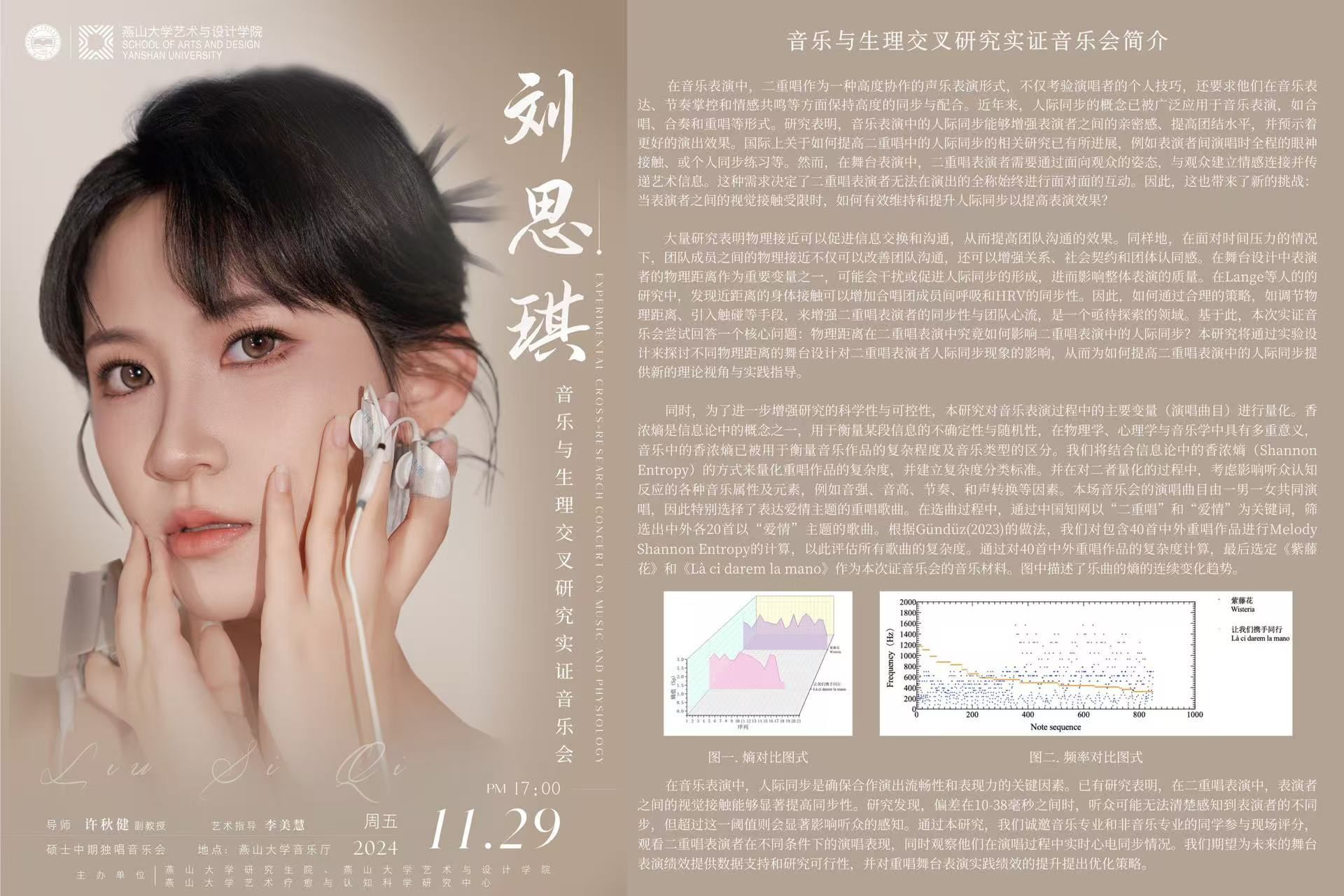 将举办“音乐与生理交叉研究实证音乐会”,以音乐为载体,探索艺术与科学的深度融合。此次音乐会旨在从跨学科角度出发,研究人体生理的同步反应与表演动态之间的相互作用。通过音工交叉的形式,展示人际同步过程中的情绪调节与生理反馈的科学作用,推动音乐学科与生理学的交叉研究走向实践化与应用化,为跨学科研究提供新的可能性和发展方向。