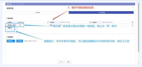 注意事项:1、“基础设置”菜单为“指标库”,可以查看和新增指标,新增的指标可以用在创建“随堂评教”问卷中(或直接创建“随堂评教”问卷,在问卷中直接新增指标也可)