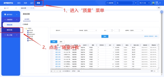 登录成功之后,鼠标移至上方“质量”菜单,点击“随堂评教”即可进入“随堂评教”页面。
